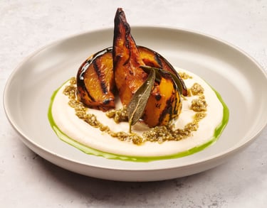 Sweet roasted Festival pumpkin meets the rich umami of fermented shio-koji tofu cream, balanced by a vibrant sage and parsley oil and a crunchy pumpkin seed crumble for texture.