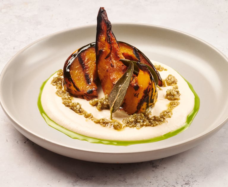 Roasted Carnival Pumpkin with Shio-Koji Tofu Cream, Herb Oil & Crispy Sage