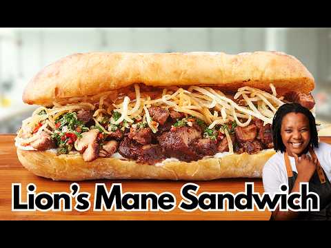 Discover this juicy Lion’s Mane Mushroom Sandwich with zesty chimichurri and crispy shoestring fries — a plant-based twist inspired by Derek Sarno.